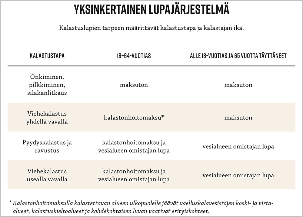 Kalastonhoitomaksu on monelle kalastajalle olennaisin kalastuslupa. Kalastonhoitomaksu tulee maksaa, jos on iältään 18–69-vuotias ja kalastaa yhdellä vavalla ja vieheellä, pyydyskalastaa tai ravustaa. Poikkeuksena ovat kalastajat, jotka ehtivät täyttää 65 vuotta 31.12.2023 mennessä, he ovat vapautettu kalastonhoitomaksusta. Maksamisen tarpeen määrittää kalastajan syntymäpäivä, ei syntymävuosi. Onkimiseen, pilkkimiseen ja silakanlitkaamiseen ei tarvita kalastuslupia, vaan ne kuuluvat yleiskalastusoikeuksiin.